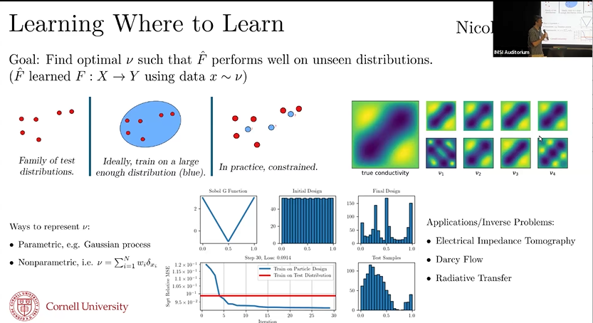 Back to topThis workshop addresses the “physical-to-virtual” leg of the Digital Twins (DT) framework, in which observational or experimental data from the physical system is assimilated into a virtual model of its dynamics on a moving time horizon to infer model components (such as initial conditions boundary conditions, material coefficients, source terms). The focus will be on statistical formulations of data assimilation and inverse problems, notably the Bayesian framework, motivated by the critical need to quantify and manage uncertainty in DTs from data to inference to prediction to decisions. Several major challenges that arise in the DT framework will be addressed: (1) the goal-oriented (“fit-for-purpose”) nature of DTs, implying that the inverse solution needs to be accurate with respect to the downstream prediction/control quantities of interest, as opposed to the full parameter or state fields; (2) the real-time nature of DTs (dictated by the time scales of the dynamical system), necessitating fast algorithms for inference; (3) the fact that DTs typically describe complex physical systems (large-scale, multiphysics, multiscale, multirate) with high dimensional parameter/state spaces (often discretizations of infinite dimensional fields), necessitating scalable dimension-independent formulations and algorithms; (4) the need for inference methods that can exploit the sequential nature of the data assimilation/inverse problems; (5) the forward models often will include stochastic forcings, leading to “intractable” likelihoods that must be dealt with; and (6) the crucial task of accounting for model (structural) uncertainty in Bayesian inference remains an open problem in the general setting.