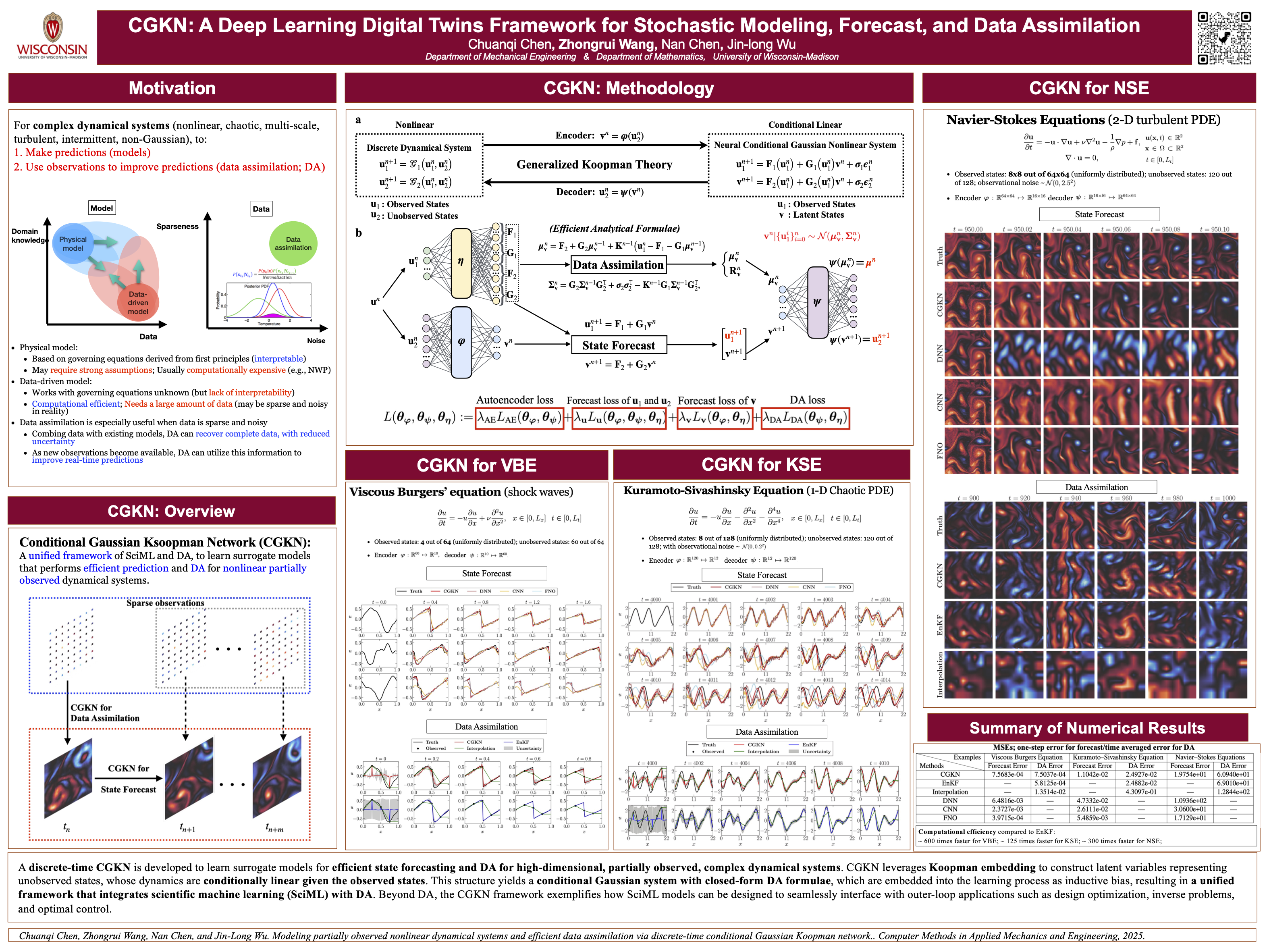 Presenter: Zhongrui Wang (University of Wisconsin, Madison) Collaborator(s): Chuanqi Chen, Nan Chen, Jin-long Wu Title: CGKN: A Deep Learning Digital Twins Framework for Stochastic Modeling, Forecast, and Data Assimilation