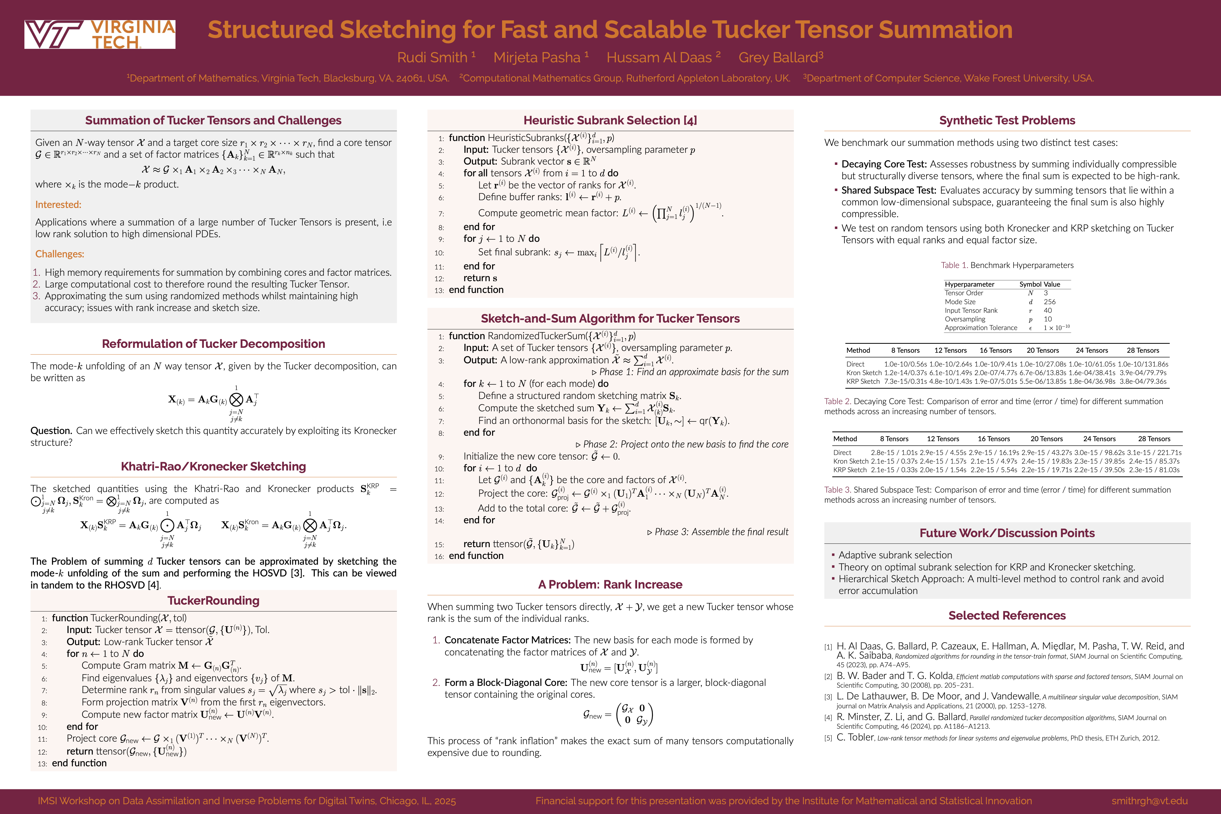 Presenter: Rudi Smith (Virginia Polytechnic Institute & State University (Virginia Tech)) Collaborator(s): Mirjeta Pasha, Grey Ballard, Hussam Al Daas Title: Structured Sketching for Fast and Scalable Tucker Tensor Summation