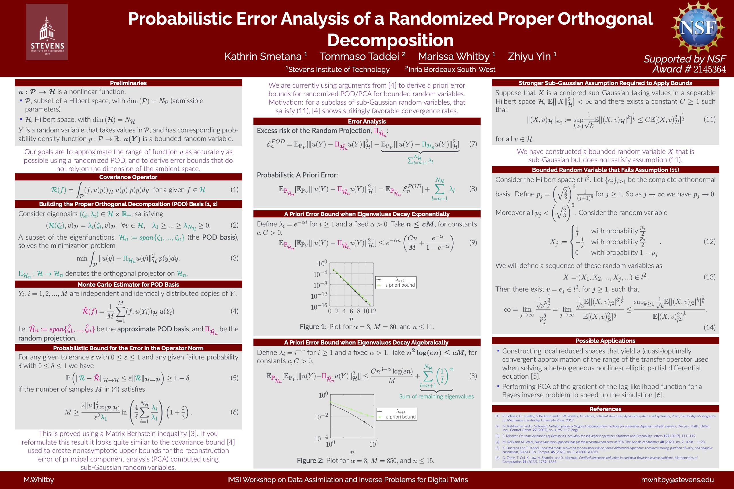 Presenter: Marissa Whitby (Stevens Institute of Technology) Collaborator(s): Kathrin Smetana, Tommaso Taddei, Zhiyu Yin Title: Probabilistic Error Analysis of a Randomized Proper Orthogonal Decomposition